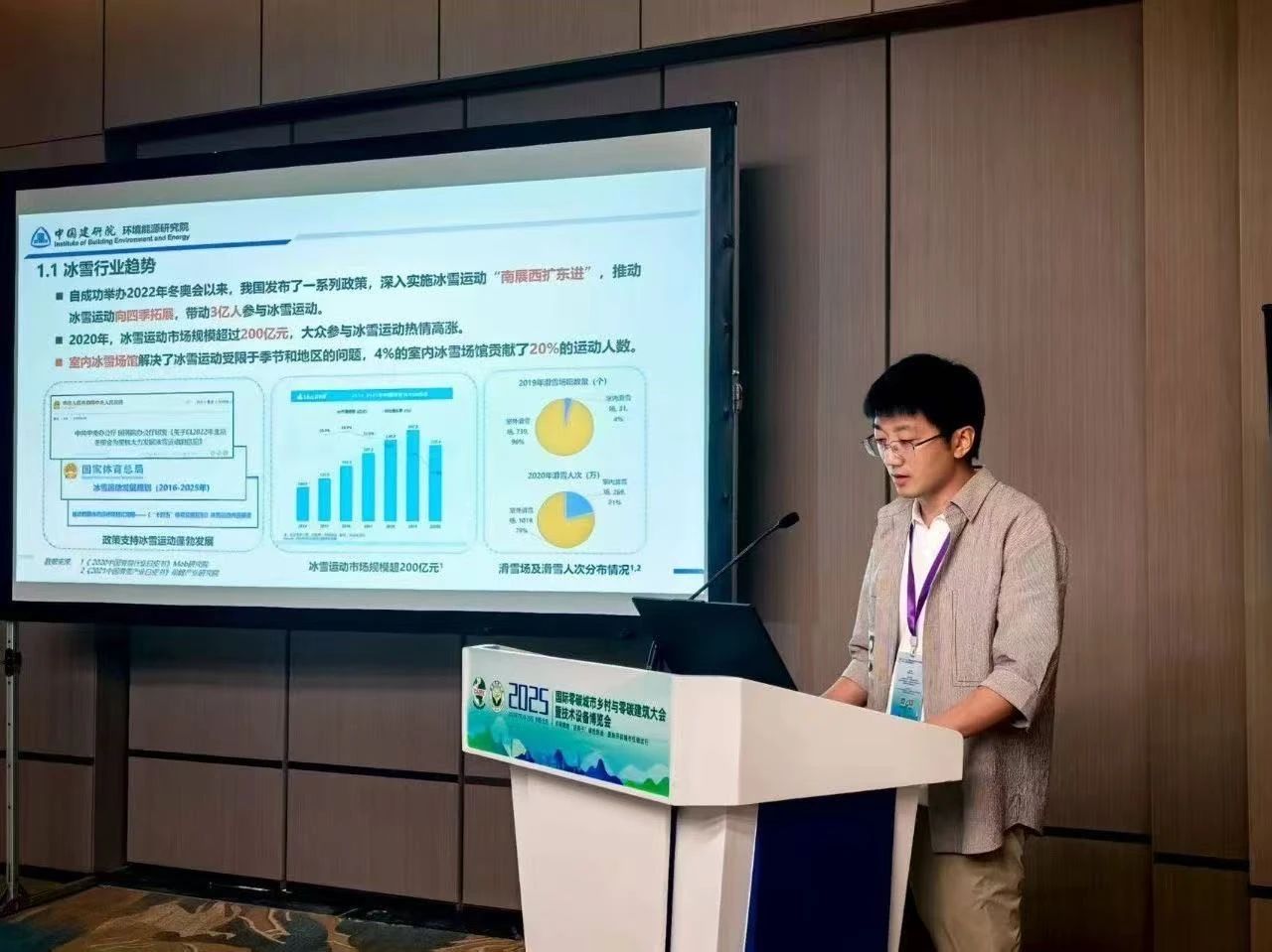 深度参与“2025国际零碳城市乡村与零碳建筑大会暨技术设备博览会”中两个专题论坛并作技术汇报。在“低碳/零碳办公建筑研究与实践”专题论坛中介绍了房地产企业碳盘查与碳中和技术路径,在“室内滑雪场馆节能降碳实践”专题论坛中解读了《低碳室内冰雪场馆技术规程》,为办公建筑、室内滑雪场馆绿色低碳发展提供技术支撑。