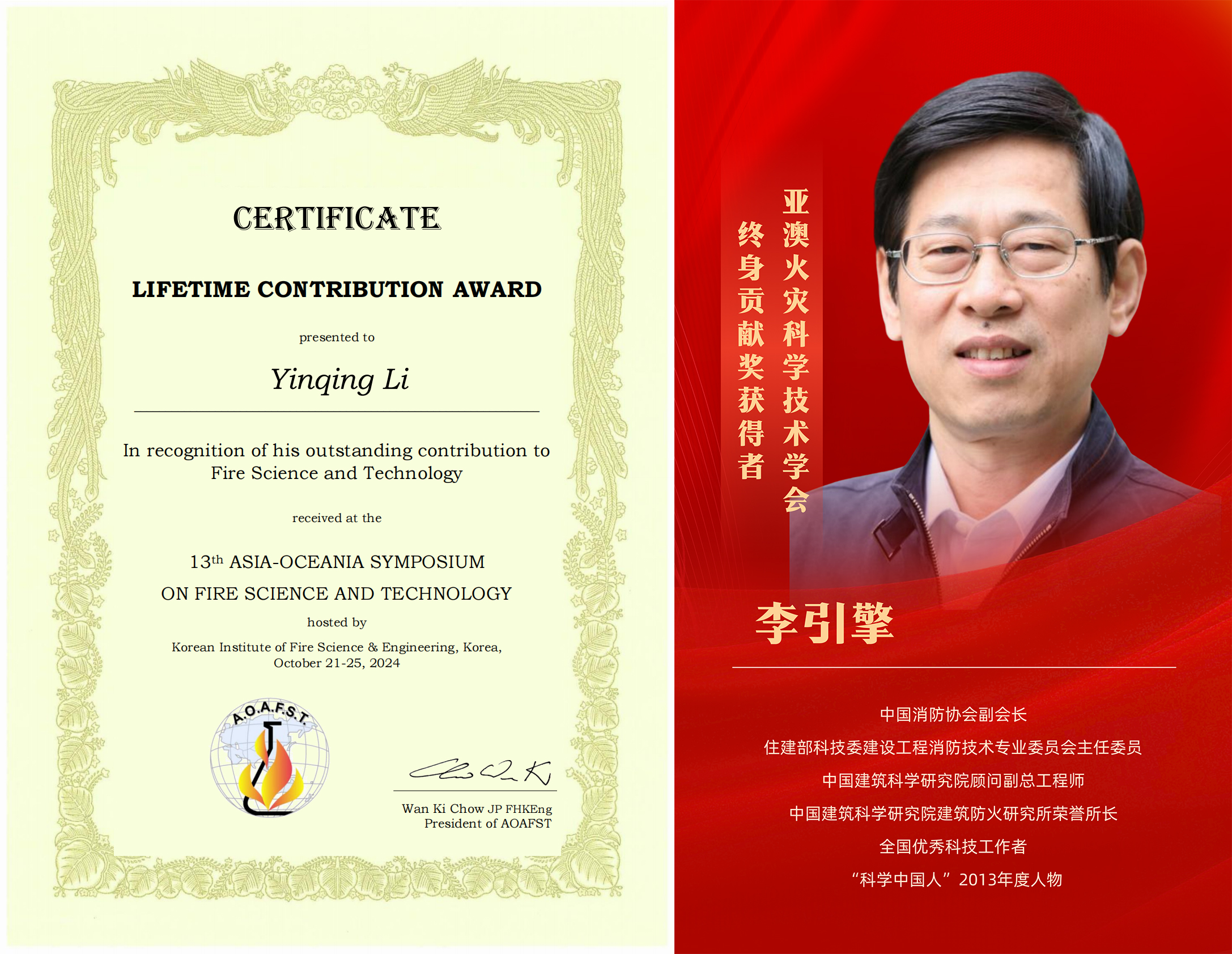 亚澳火灾科学技术学会终身贡献奖,是面向世界各国每三年颁发一次的国际奖项。该奖每次仅遴选出2-3名在火灾科学研究领域作出卓越贡献、取得突出成就的学科带头人和科学家授予奖项,是亚澳火灾科学技术学会颁发的最高荣誉奖。
