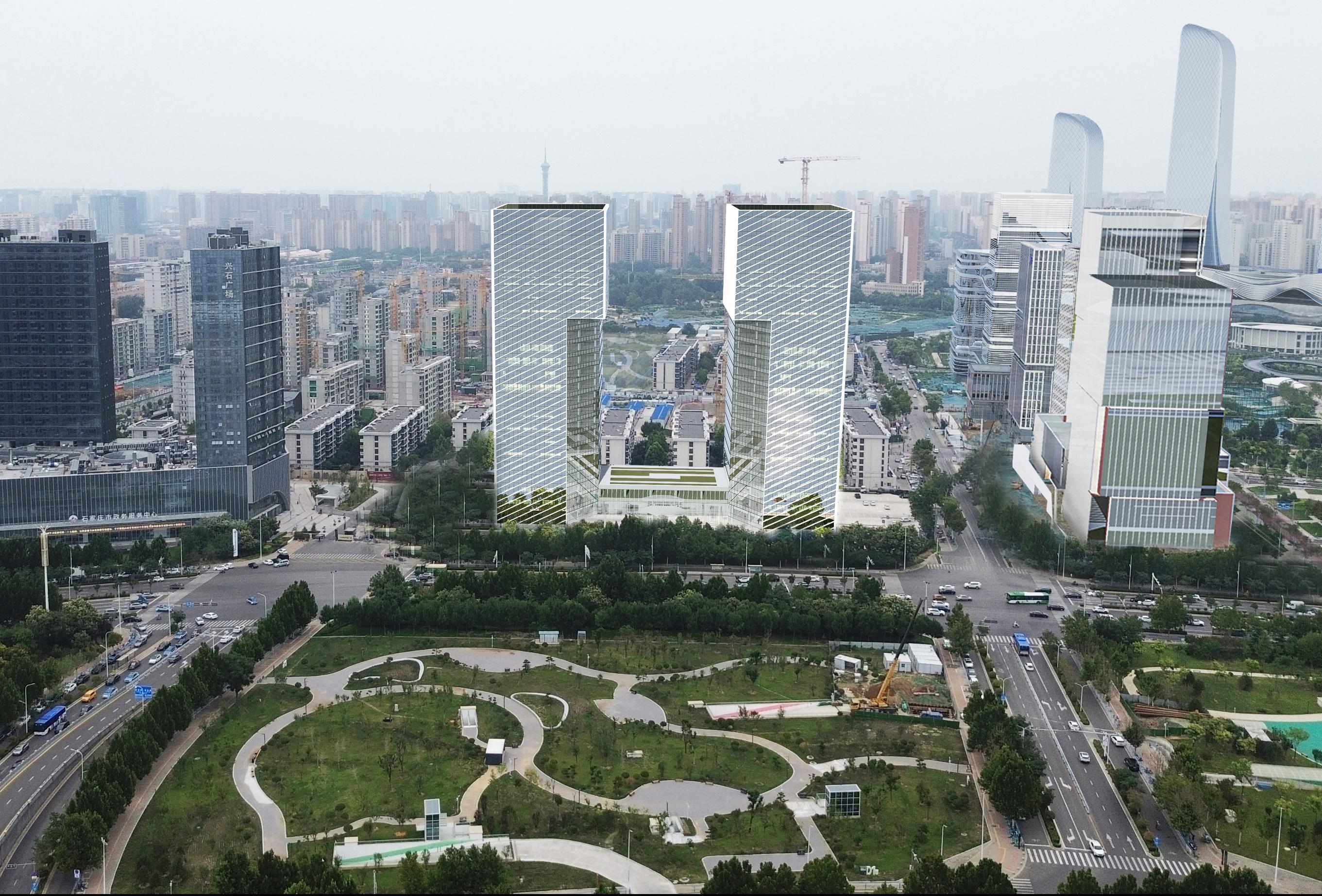 9号地块项目紧邻石家庄站东广场,是步入石家庄的一道标志性景观,彰显了城市的重要门户形象。以“城市之门”为设计理念,通过简洁的形体削切,打造高品质的金融双塔,展现具有未来视野的新时代金融办公企业总部形象。
