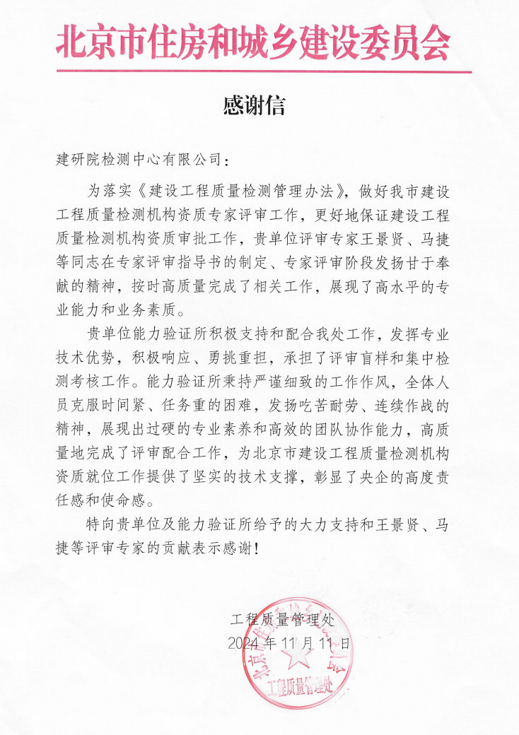 近日,北京市住房和城乡建设委员会工程质量管理处(以下简称“北京市住建委工程质量处”)发来感谢信,对检测中心以盲样、集中现场考核、专家技术支持等方式助推北京市建设工程质量检测机构资质就位工作表示感谢。