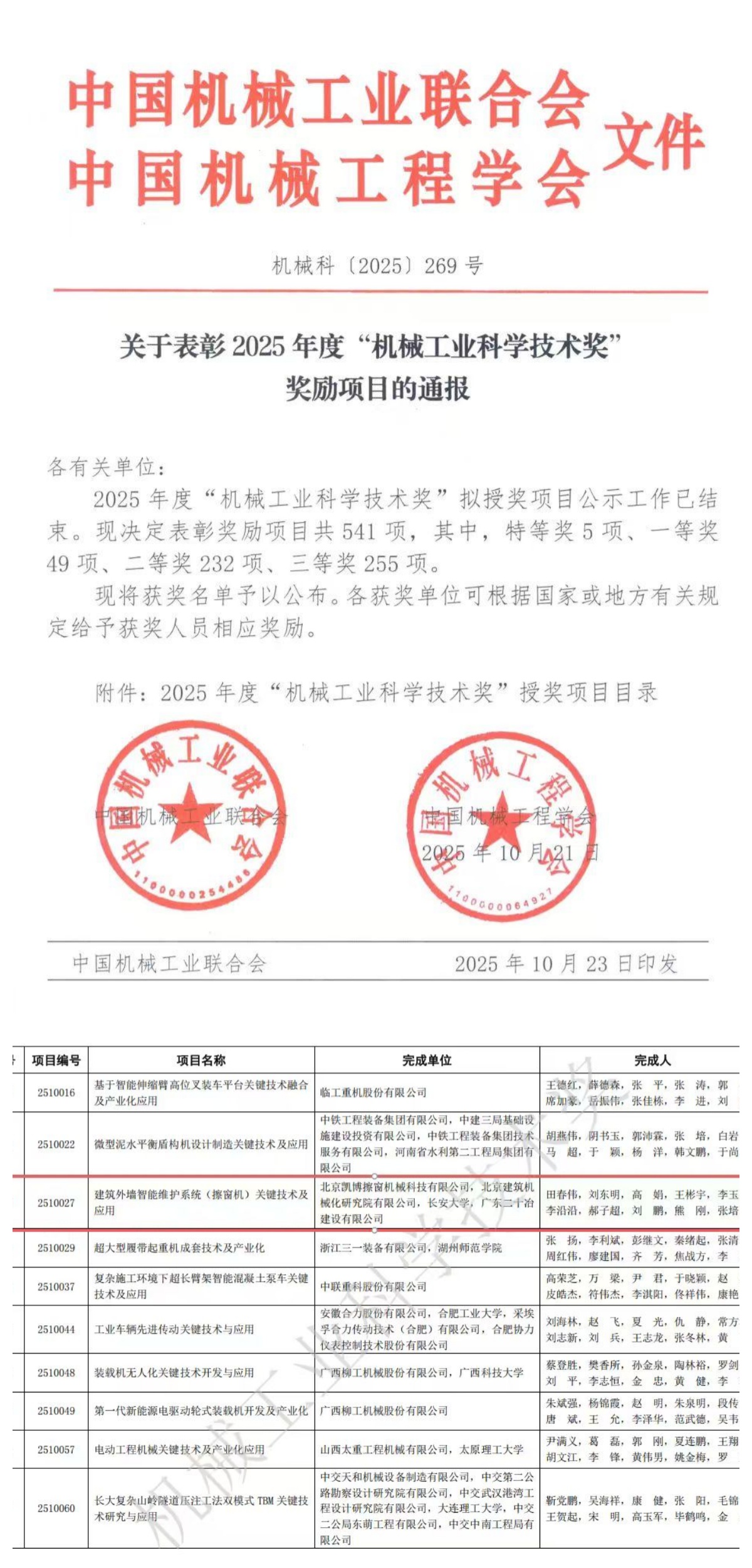 2025年度“机械工业科学技术奖”授奖项目目录已公布,北京建机院所属子公司北京凯博擦窗机械科技有限公司(以下简称“凯博擦窗”)建筑外墙智能维护系统(擦窗机)关键技术及应用,荣获“2025年度机械工业科学技术奖(科技进步奖)二等奖”。这一奖项的获得,标志着凯博擦窗的技术实力和创新成果再次获得行业高度认可,彰显了凯博擦窗在国内擦窗机领域科技创新和产业化深度融合方面的引领作用,对北京建机院高空作业装备的高端化、智能化、集成化发展具有重要的里程碑意义。