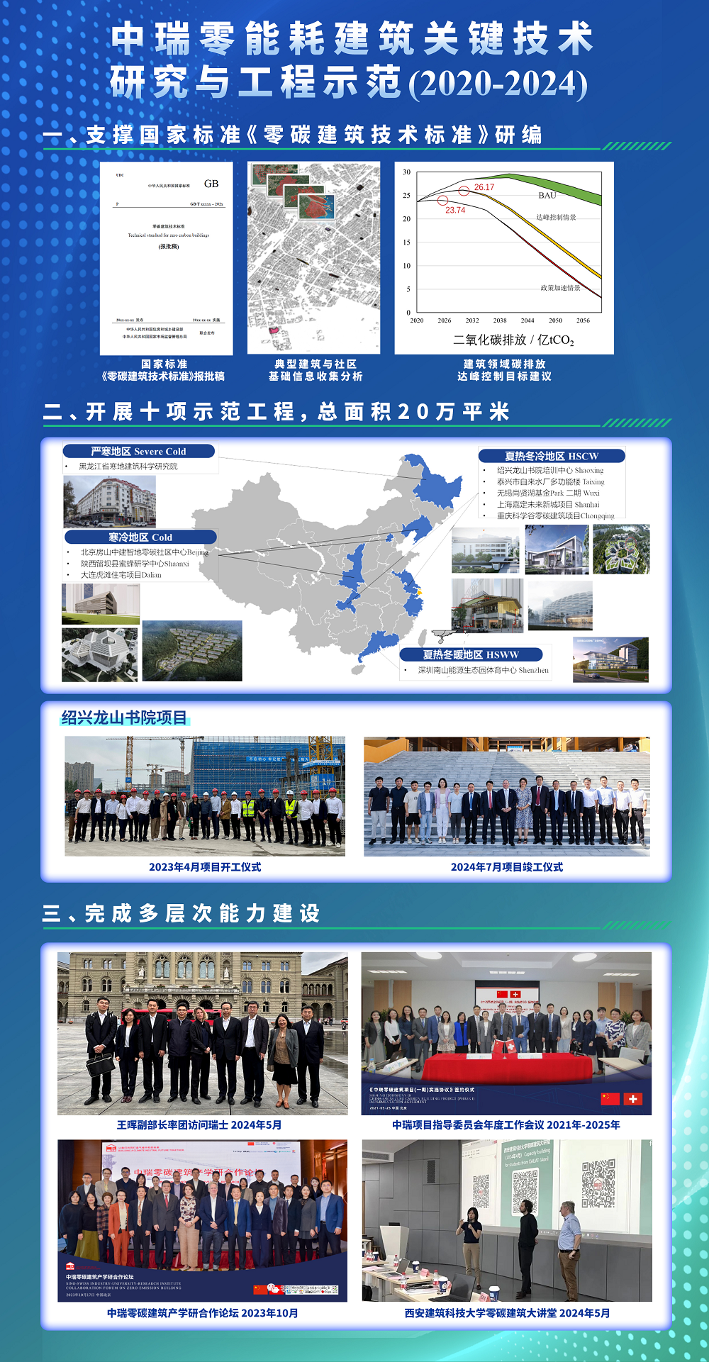 张时聪从研究背景与基本情况、研究内容与主要成果、成果转化与工程示范、考核指标完成情况、经济社会效益五个方面进行了汇报。基于中瑞双方合作,项目提出中国零碳建筑技术标准的技术建议和中长期建筑降碳路线图。开展不同气候区不同类型10项零碳建筑示范工程建设,总面积20万平米,平均降低碳排放强度50%以上,降低建筑碳排放30kg CO2/m2年,节约建筑运行费用约300万元/年。从高层对话、专业技术人员培训、行业推广3方面开展多层次能力建设和国内外技术研讨34次,覆盖行业相关人员800人。