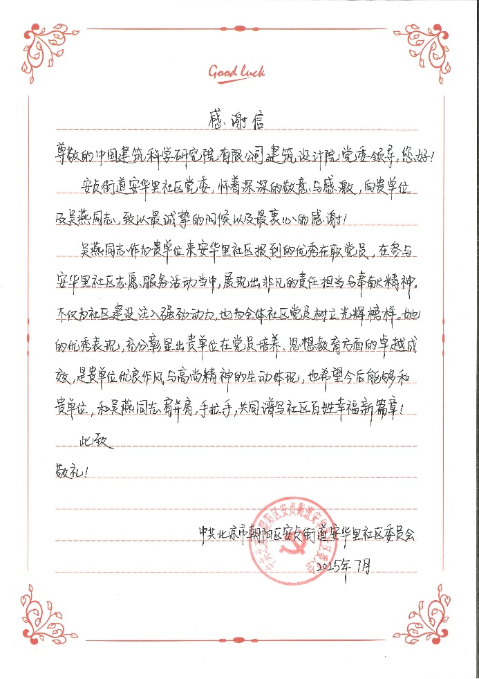 近日,中共北京市朝阳区安贞街道安华里社区委员会发来感谢信,对建筑设计院党委及设计一院党支部吴燕同志,在参与安华里社区志愿服务活动中展现出非凡的责任担当与奉献精神表示感谢。
