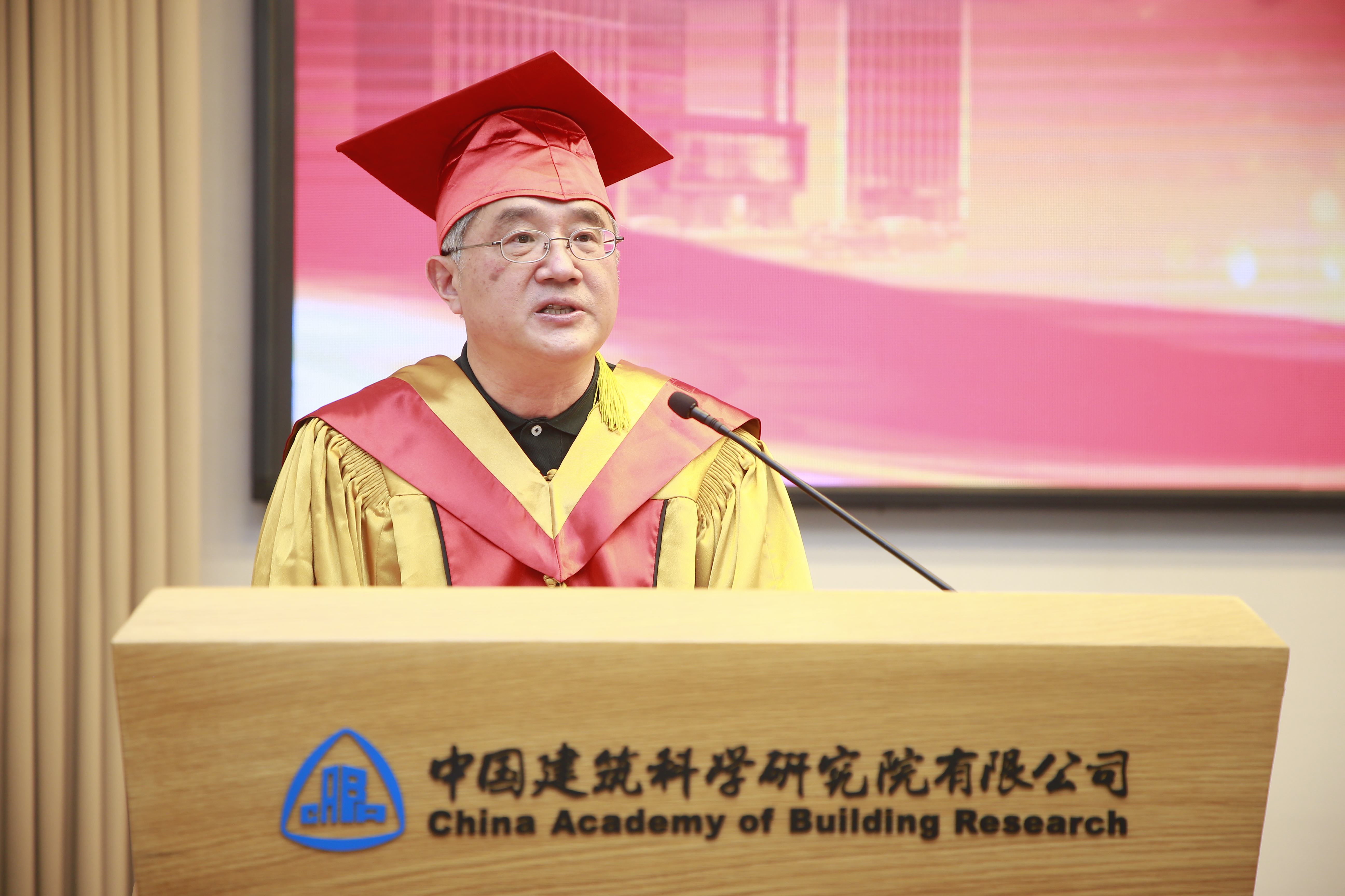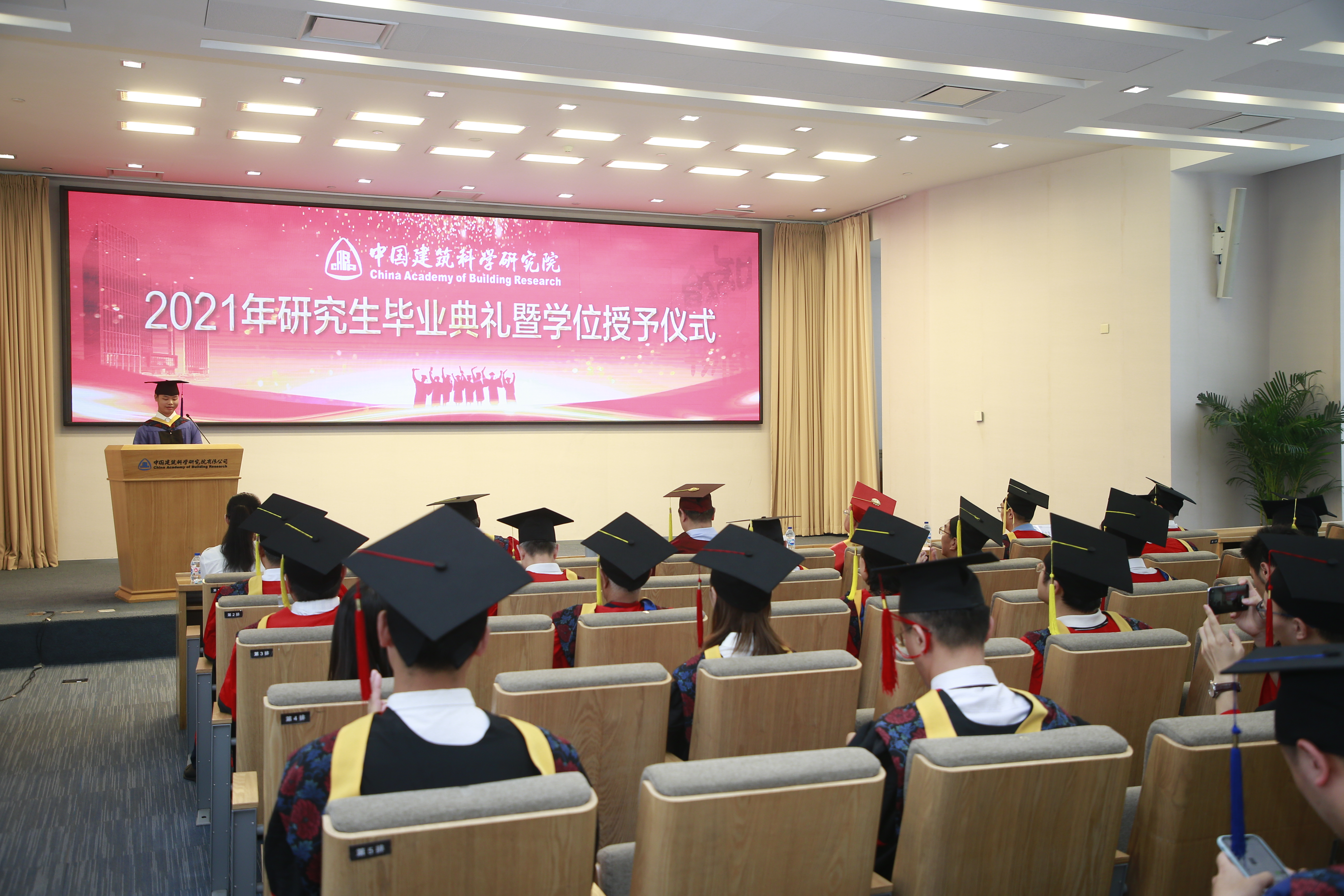 王清勤宣读了《中国建筑科学研究院关于授予2021年毕业研究生博士、硕士学位的决议》。王俊、王清勤分别为2021届毕业研究生和2020届毕业研究生代表逐一扶正流苏并颁发学位证书。