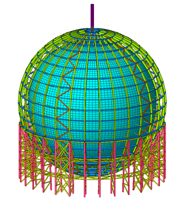 接到“中心探测器结构方案咨询”任务后,团队首要工作是深度研判探测器的技术需求,最终通过多方案比选,确定“不锈钢单层网壳+有机玻璃球”复合结构体系——网壳承担承重功能,有机玻璃球罐用于储存液体闪烁体。团队反复细化网壳分格尺寸、有机玻璃球壁厚、支撑构件参数,完成方案图纸绘制与报告编制;同时开展模拟计算进行多维度验证,形成的计算报告为方案可行性提供了科学依据。