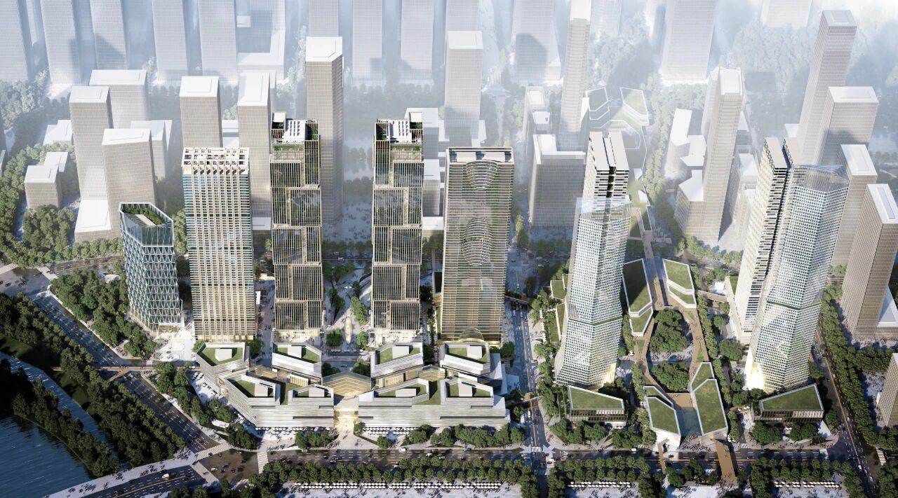 合肥·新地中心是由商业、办公、住宅、底层商铺、配套及会所等业态组成的多元化、多层次的城市综合体,由中国建研院建筑设计院和维思平建筑设计联合国际咨询(北京)有限公司共同设计完成。项目地上建筑面积41.9万平米,地下15.1万平米,包括3栋超高层办公楼及高度28米的商业建筑、5栋超高层住宅、底层商铺、配套及会所。作为合肥政务新区的地标建筑,项目的位置优越,与同为中国建研院建筑设计院承担设计工作的安徽省广播电视新中心成为“安徽之门”遥相呼应。各个超高层建筑的造型清秀挺拔、飘逸通透,并营造较大尺度的地面和空中院落、广场及庭院等外部空间。住宅建筑充分考虑合肥地区的气候特点,采用长板式、南北朝向,确保日照通风条件的良好,与其他建筑相融合,并与城市景观相衔接。中国建研院中建研科技为项目提供节能设计。