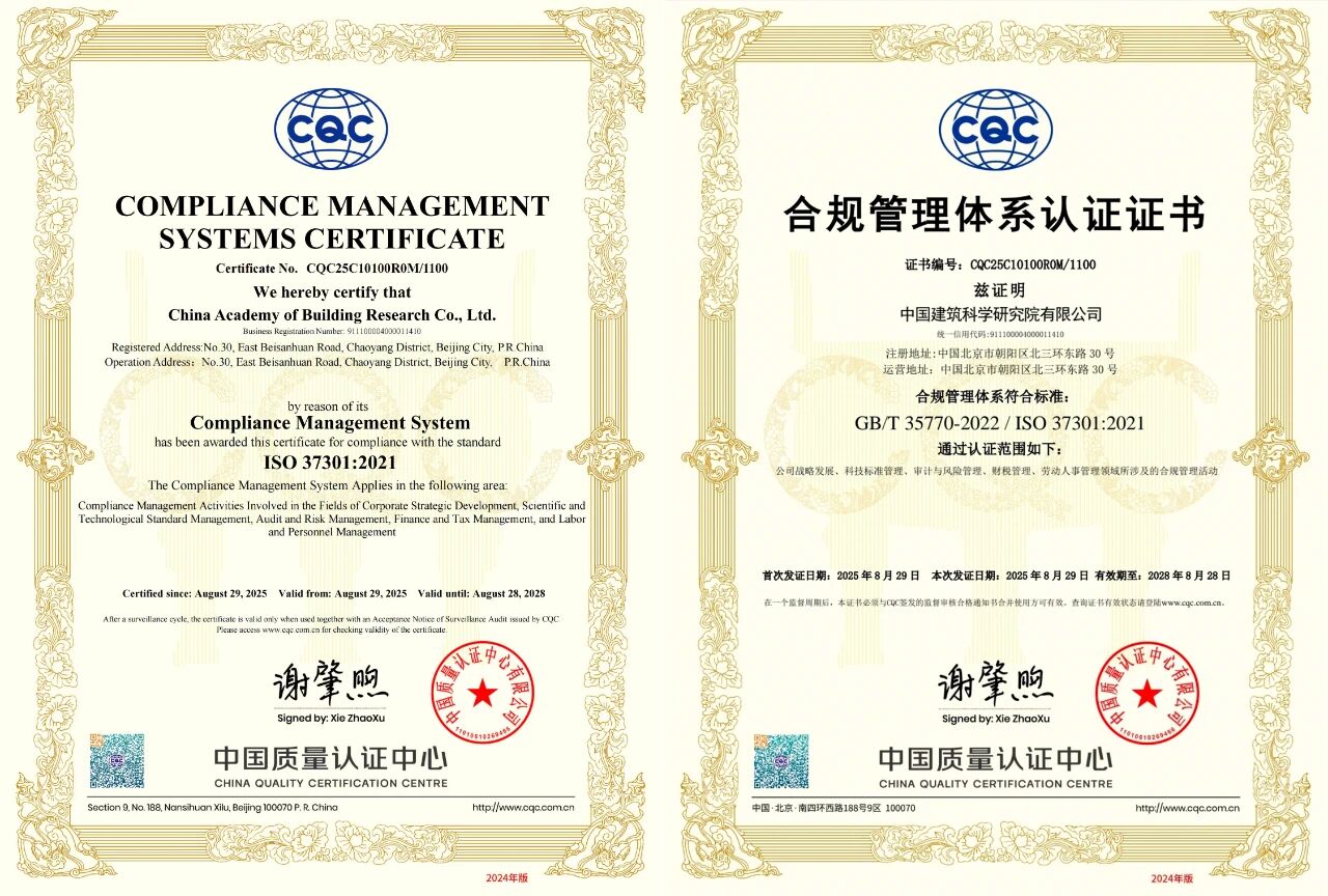 近日,中国建研院成功通过中国质量认证中心(CQC)合规管理体系审核,获得国际标准ISO37301:2021和国家标准GB/T35770-2022认证证书,标志着公司在合规治理现代化进程中迈出坚实一步。