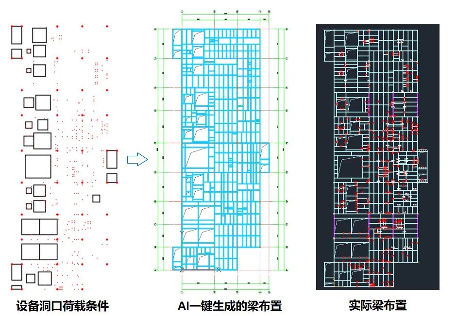 在上述AI布梁功能的基础上,构力科技团队充分结合工业框架结构的特点,考虑洞口、设备支吊架、埋件、荷载等多重因素对梁布置的影响,开发了适用于工业领域的AI布梁功能。目前该技术成果已应用于三维工厂协同设计软件BIMBasePlant-S中。