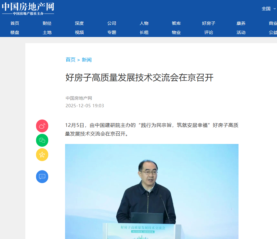 12月5日,由中国建研院主办的“践行为民宗旨,筑就安居幸福”好房子高质量发展技术交流会在京召开。中国建研院党委书记、董事长许杰峰面向行业发布“365好房子体系”共建倡议,中国建研院党委副书记、总经理樊金龙正式发布中国建研院“365好房子体系”。中国房地产报多角度报道好房子高质量发展技术交流会,并报道中国建研院科技支撑好房子建设的举措成效。