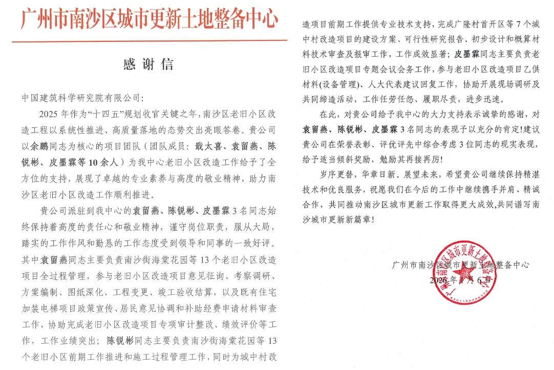 信中表示,中国建研院天津分院在南沙区老旧小区改造工作中展现出卓越的专业素养与高度的敬业精神,驻场人员履职尽责、勤恳踏实,取得了显著的工作成效。