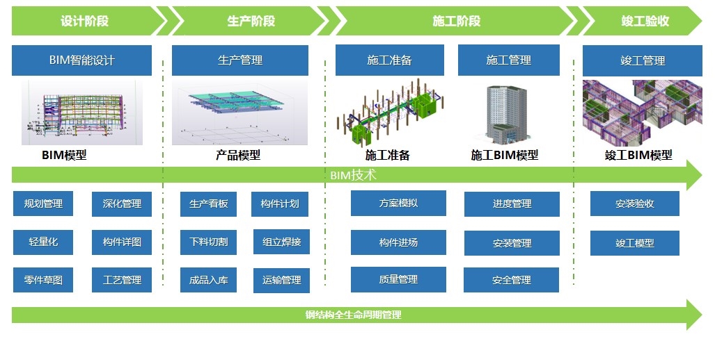 钢结构全生命周期智慧建造平台,根据钢结构生产企业的管理特点,以信息化、BIM、物联网、云计算、大数据等技术为支撑,实现了钢结构项目设计、生产、运输、施工、运维等全过程流程化、信息化、智能化管理。 基于BIM的钢结构全生命周期管理,打通设计、生产,对接施工安装流程,包括:工厂管理、项目管理、合同管理、设计管理、计划管理、生产管理、材料管理、质量管理、安全管理、技术管理、设备管理、运输管理、现场管理、资料管理、堆场管理、BIM管理等,实现精细化管理、一体化管理。
